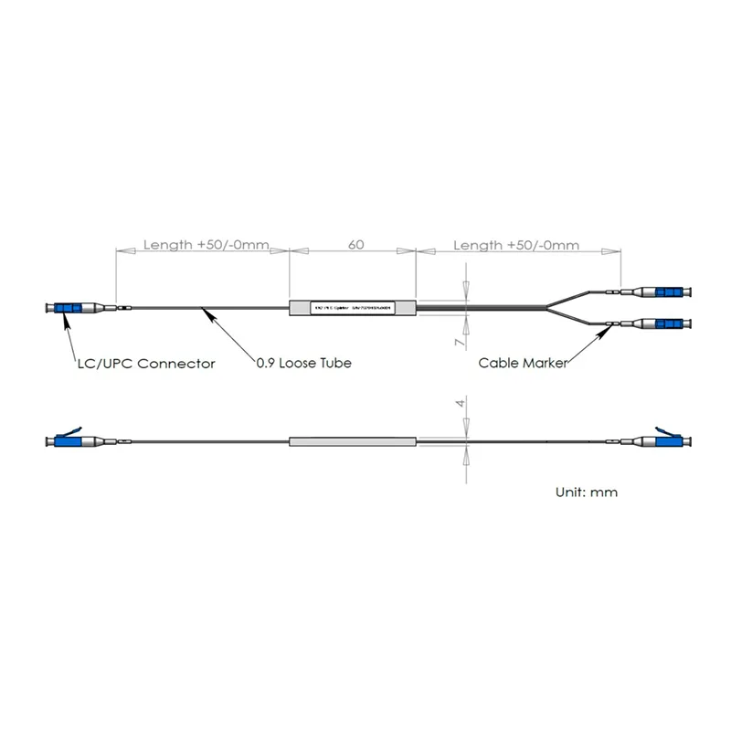 1 × 2 plc स्लन्ट्टर स्टील ट्यूब प्याकेज 600μx4x4x4mm, 900μm luge ट्यूक ट्यूब 1.0 मीटर, एलसी / अपक कनेक्टर।